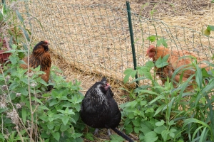 Our hens, Amelia, Little Wing, and Chezabu hanging out among some catnip and hops