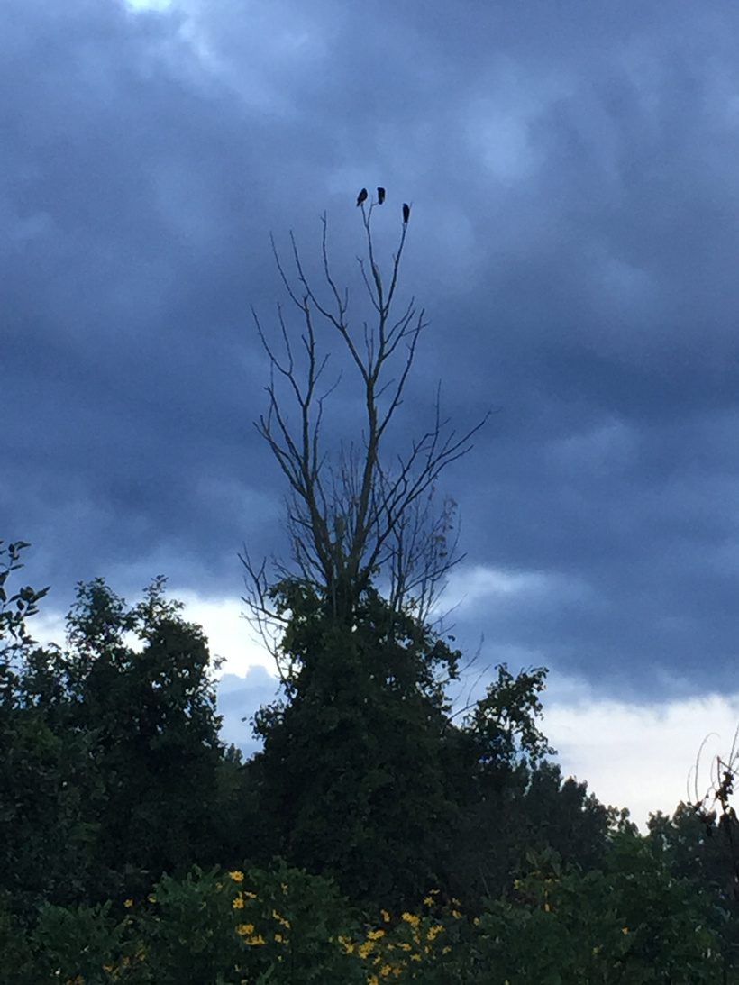 These three crows greeted me early one morning, and as I greeted them in return, one flew down right past me, and then looped back up to the tree.