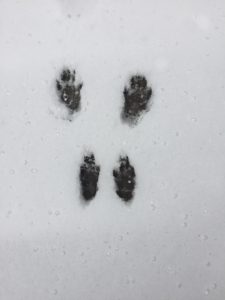 (Some squirrel tracks on the bridge. As Brennah pointed out, the squirrel was running (hopping) because the front feet (smaller ones) are in the back. You can also see the bits of hail in the snow.)