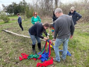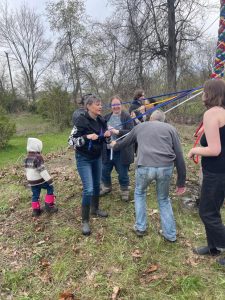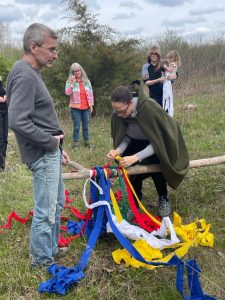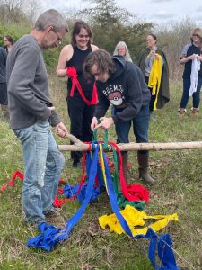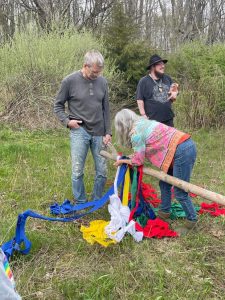 After our initial ritual in the fire circle, we headed out to the Maypole which was still standing and dressed with last year’s ribbons. The pole was brought down, the old ribbons taken off, and then everyone tied their new ribbons to the pole before standing it back up again.