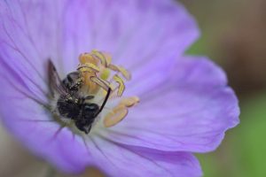 A Miner Bee – likely to be specifically a Cranesbill Miner Bee, which specializes in Wild Geraniums. (Miner bees are hard to tell apart.)
