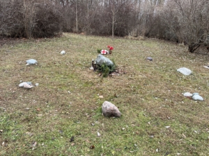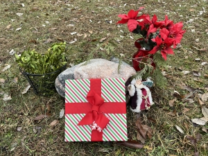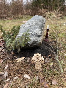 The North stone decorated for Christmas as we go around the wheel of the year / stone clock reflecting the big sky clock of our planisphere.