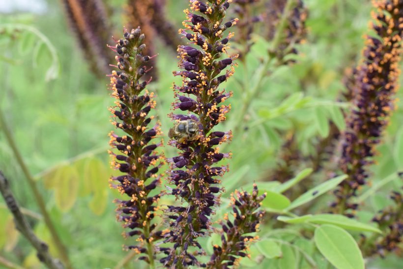 “False Indigo Bush blooms are a great place to learn identification of native solitary bees which are their primary pollinators. The blooms come at a time in which most wildflowers are not blooming – in the transition between spring and early summer.”