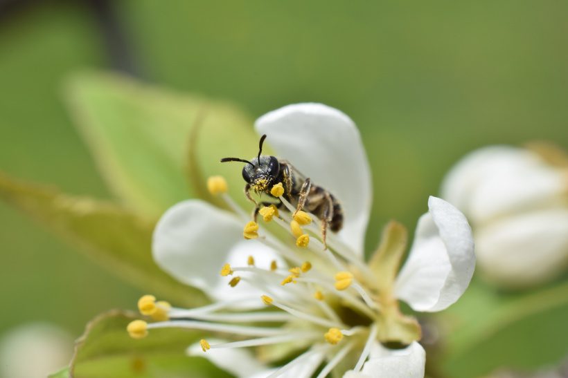 (Native Bee on Wild Plum Blossom feeding on pollen at Crossing Hedgerows – by Brennah Cavanaugh Photography LLC – copyright protected)