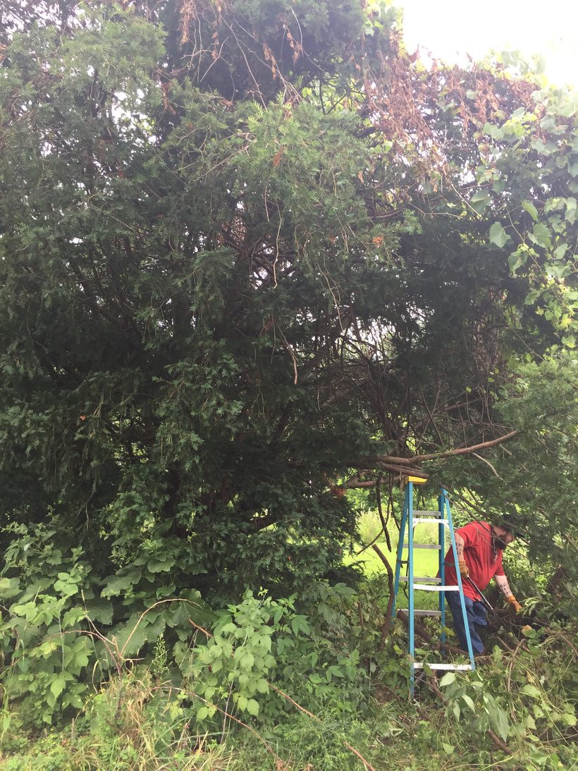 Sarenth and Emily clearing grape vines off the Yew tree