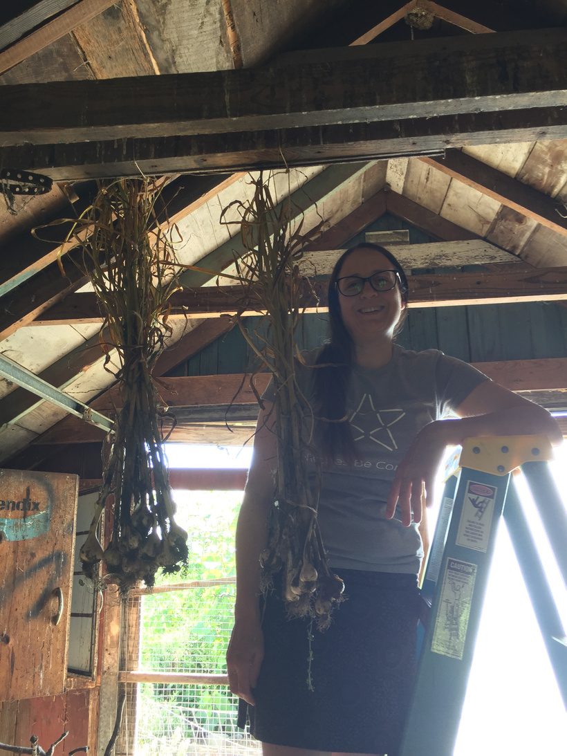 Alissa hanging garlic in the drying shed