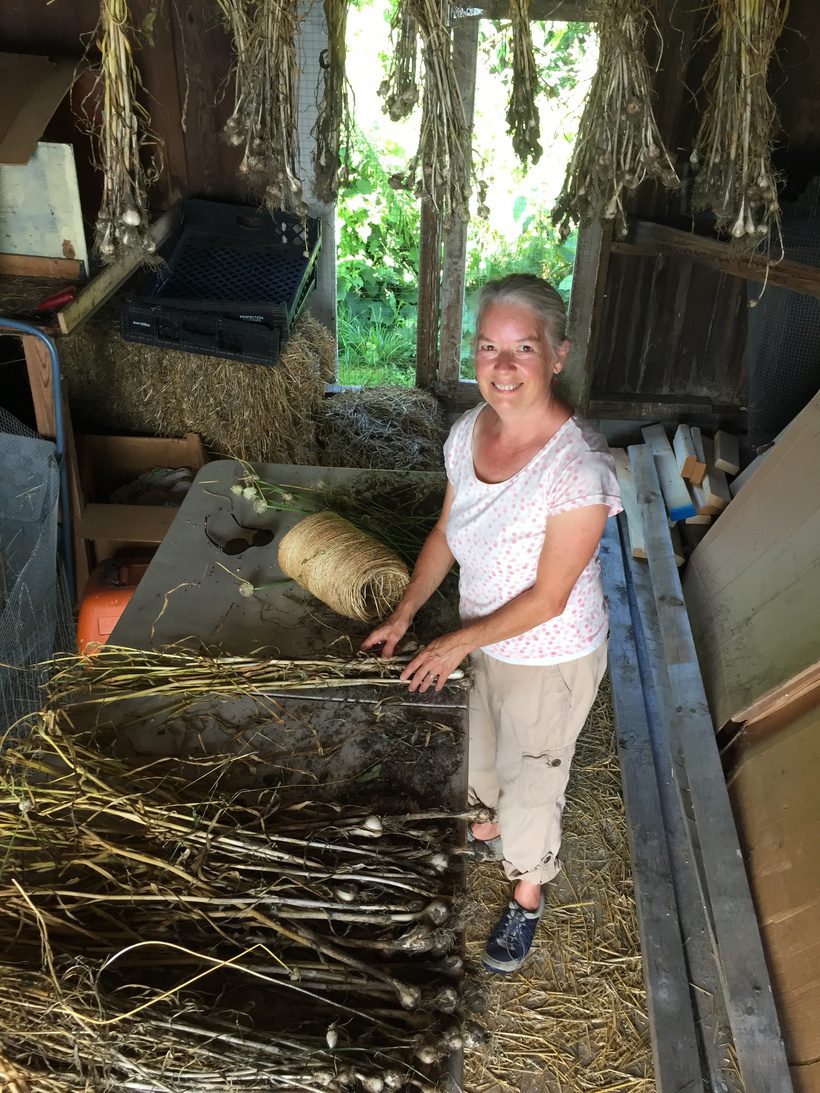 Jean bundling garlic in the drying shed