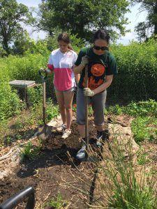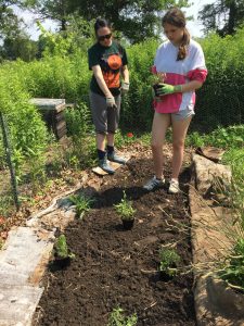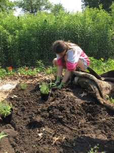 It was great to have Alyssa and daughter, Allie come out on Saturday for a work day. They finished harvesting the garlic scapes, weeded a flower bed, and dug and planted a bed of thyme plants which we started from seeds earlier this spring. They also helped me transplant a paw paw tree seedling to a wetter area where it will hopefully be happier.