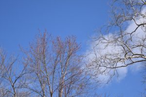 Sillouette of a Silver Maple with flower buds and Sycamore against a bright blue sky – Mar 10, 2017, Photo by Brennah Cavanaugh