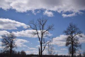 Leefless trees silhouetted in front of a bright blue sky with fluffy white clouds floating by – Mar 10, 2017, Photo by Brennah Cavanaugh