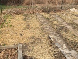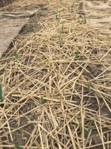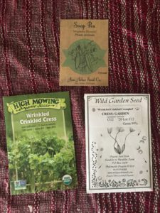 The garlic we planted last fall on one of our work days has sprouted. I planted some peas and cress along the back fence of the same garden this week.