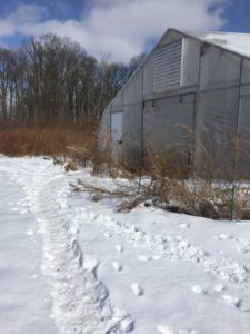 One of the aspects of the farm is the hoop house. It is a 30’x72′ structure that we use for year-round growing and we keep some of our chickens in it during the winter time. If you look closely at the front of it, at the top is a square louvered opening. The hoop house has electricity run to it and the louvers open and close automatically according to the temperature to which we have the thermostat set. Right now, it’s set at 56 degrees and I noticed yesterday that while it was 16 degrees outside, it had gotten warm enough in the hoop house that the louvers had opened.