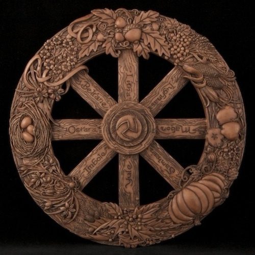 In the video above, you can follow the kitty and bunny tracks with me out to the Stone Circle. I added some rocks yesterday to finish creating the eight fold wheel of the year around the central stone. So you can see eight stones representing the quarters and cross quarters celebrations, as represented on the wheel below.