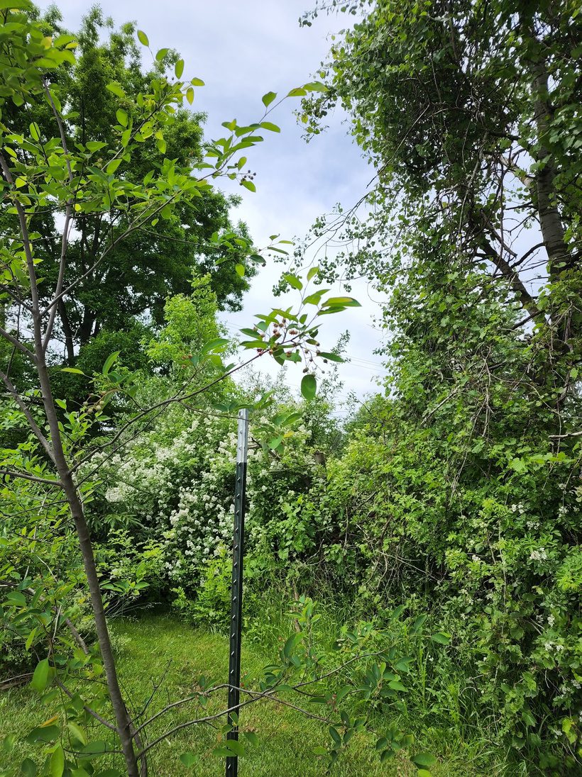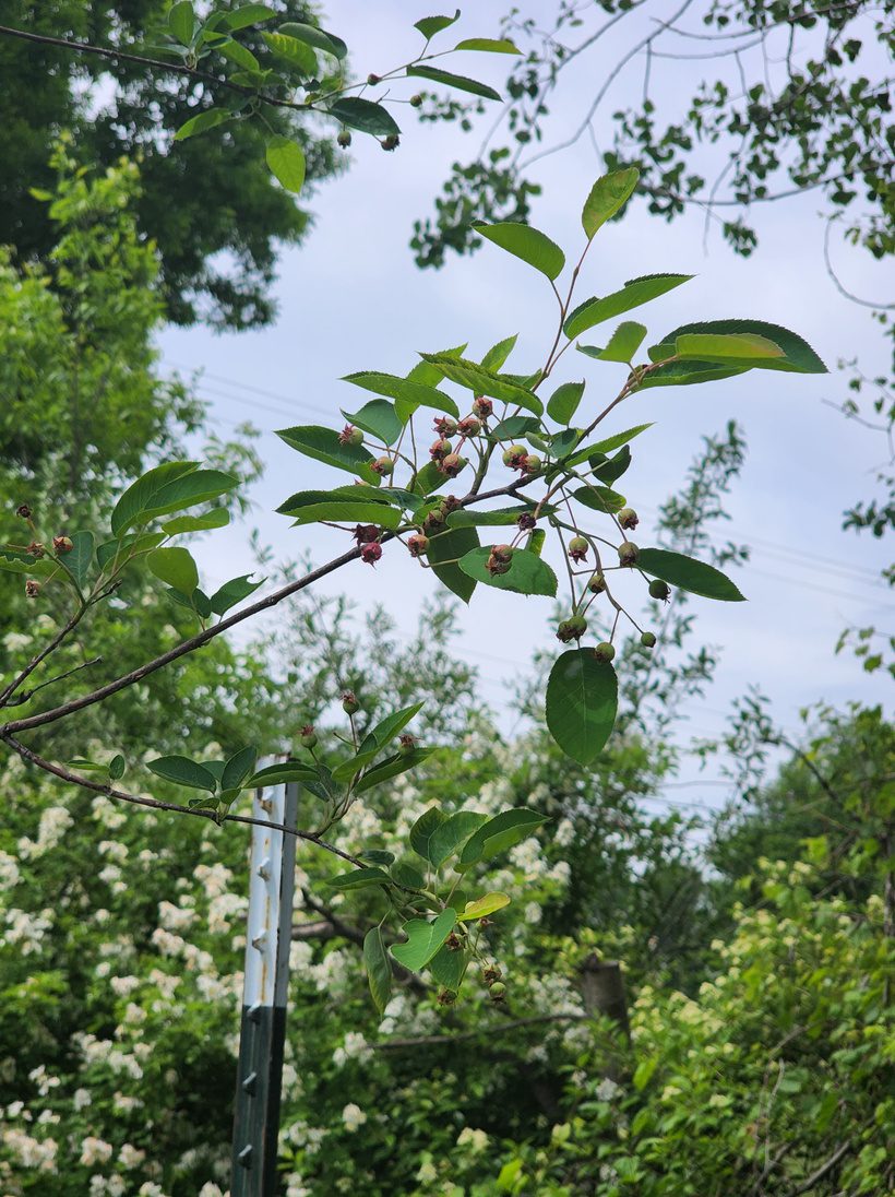 Juneberry tree with berries on it… Wild rose bush blossoming in the background