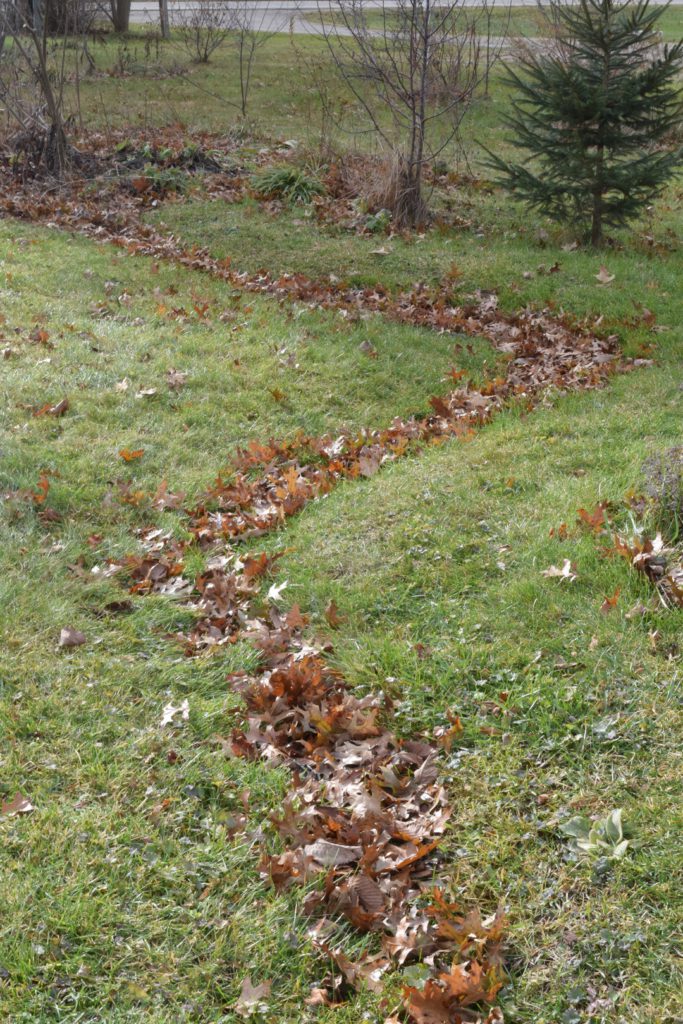 leaves collecting along the edge of the swale and the berm which we made for holding and storing water for our plantings
